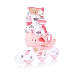 WILD BABY SKATE je dívčí set určen pro začátečníky a rekreační bruslení. Set obsahuje 1 pár kolečkových bruslí, helmu, 3-sadu chráničů (kolena, lokty, zápěstí), vše v praktickém batohu na záda. Brusle mají jednoduchý a pohodlný systém nastavení velikosti. Brusli lze nastavit na 4 velikosti. Kolečkové brusle možno nastavit na stabilnější variantu a to zdvojením zadních koleček, každé balení obsahuje i tzv. dlouhou osu. http://www.youtube.com/watch?v=NnzNoHNjVxI U velikostí brusle XS, S jsou pro krátký podvozek jen 3 kolečka CATCH 64x24mm 82A.