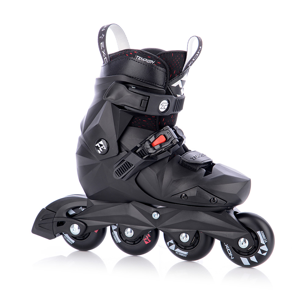 Dětské roztahovací brusle TEMPISH EXON jsou určené pro sportovní i rekreační bruslení. Střední a vysoká zátěž, vhodné pro začínající i pokročilé bruslaře. Brusle mají jednoduchý a pohodlný systém nastavení velikosti pomocí inbusového klíče (vel. 4) na patní části skeletu. Botu je díky tomu možno přenastavit na požadovanou velikost v daném rozmezí po milimetrech, nikoli po celých číslech. Plastový skelet brusle je velmi robustní a poskytuje výraznou oporu při bruslení. Mezi druhým a třetím kolečkem se nachází mechanismus pro nastavitelné zpomalování rychlosti bruslení, díky čemuž se děti mohou postupně zdokonalovat a učit se bruslit. Vnitřní botička (liner) je silně vyztužen a bohatě polstrovaný. Nártový pásek je s mikropřezkou, která zajistí pevné dotažení a usazení chodidla v botě. Vnější nártové chrániče jsou připevněny dvěma šroubky a při poškození je možno je vyměnit.