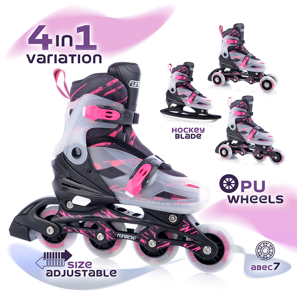 Model FunActiv ADAPT GIRL 4in1 jsou univerzální roztahovací brusle pro děti a teenagery, které nabízí maximální variabilitu použití – od inline bruslení přes stabilnější „quad“ konfiguraci až po zimní bruslení na ledě. Ideální volba pro všechny, kdo chtějí jedny brusle na celý rok.