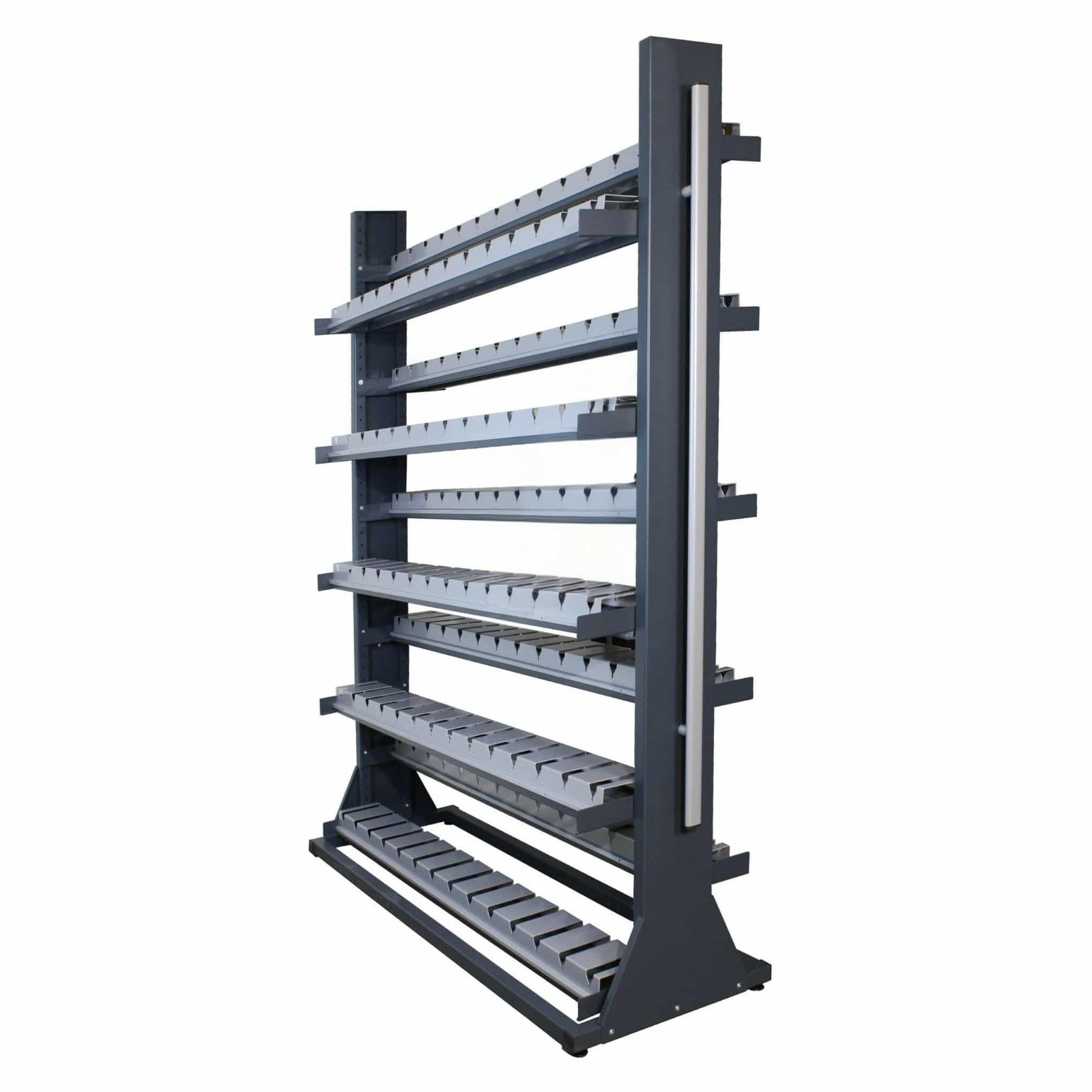 Regál je oboustranný a je vybaven nastavitelnými nožkami, případně pojezdovými kolečky nebo kolečky pro instalaci na kolejnici v případě instalací více regálů do jedné prostory.
