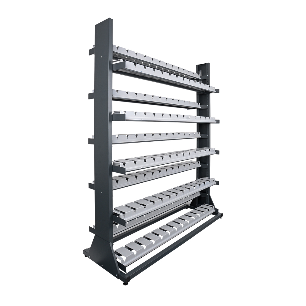 Regál je oboustranný a je vybaven nastavitelnými nožkami, případně pojezdovými kolečky nebo kolečky pro instalaci na kolejnici v případě instalací více regálů do jedné prostory.